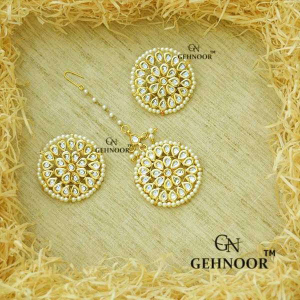 Kundan & Fine Pearl Round Stud Earrings with Round Maangtika