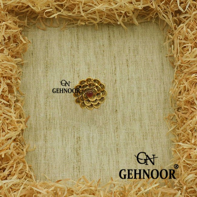 Maroon Ruby Studded Flower Temple Gold Adjustable Finger Ring