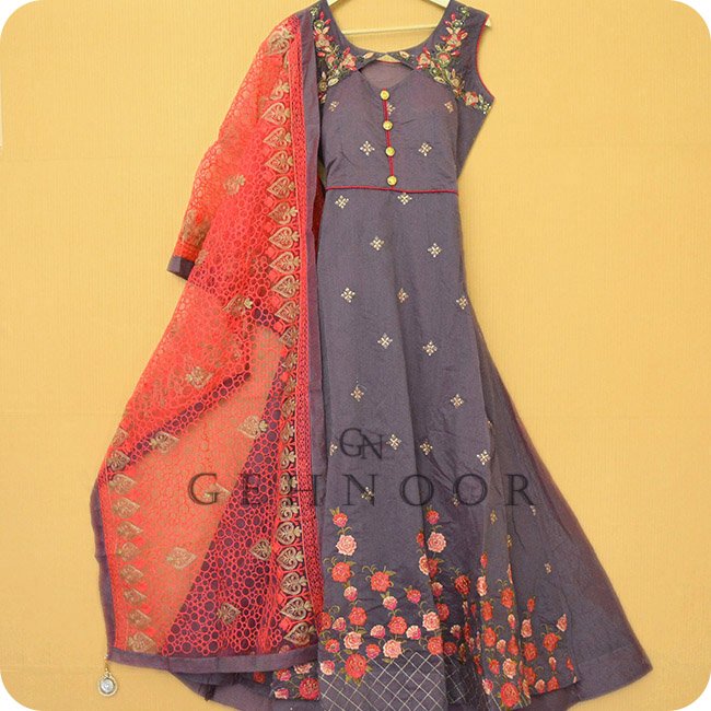 Golden and Pink Zari, Sequins & Threadwork Embroided Plum Purple Chanderi Silk Anarkali Dress and Pink Net Dupatta with Golden Threadwork Embroidery