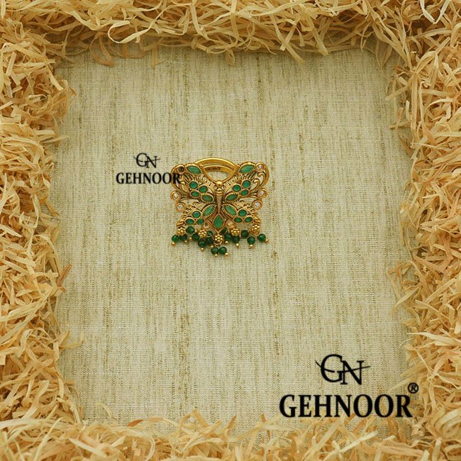 Green Emerald Studded Butterfly Shapped Gold Adjustable Finger Ring