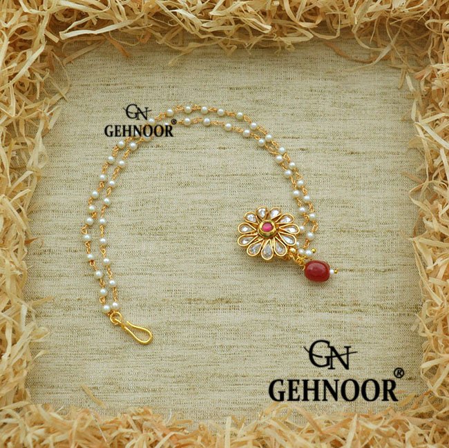 Champagne Stone and Ruby Studded Kundan NoseRing/Nath with Pearl Chain [Clip On]