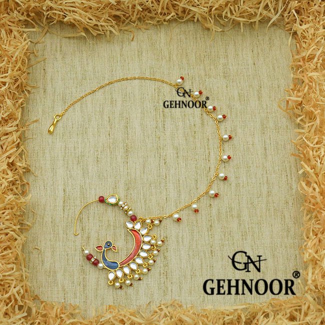 Peacock Shapped Kundan NoseRing/Nath with Pearls/Gold Chain [Piercing Required]