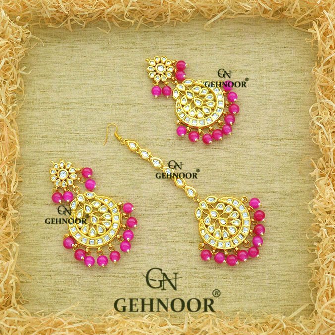 Kundan Chandbali Earrings & Maangtika with Pink Pearls