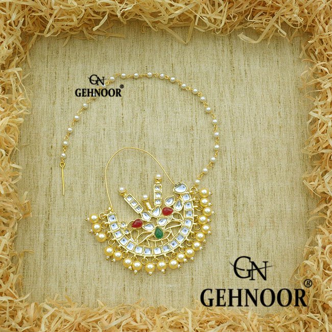 Ruby & Emerald Studded Kundan and Cream Pearl NoseRing/Nath