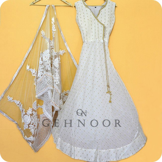 Golden Zari Threadwork Embroided White Chanderi Silk Anarkali Dress and White Threadwork Embroided White Net Dupatta